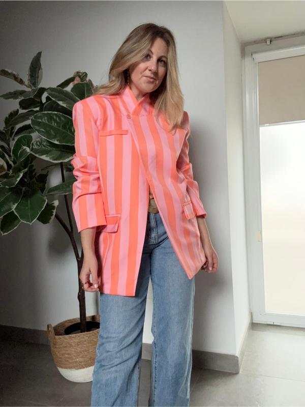 Chaqueta blazer de corte recto/oversize y estilo asimétrico (también se puede poner con las solapas normales) con una combinación de color rosa y naranja. Lleva forro y hombreras.