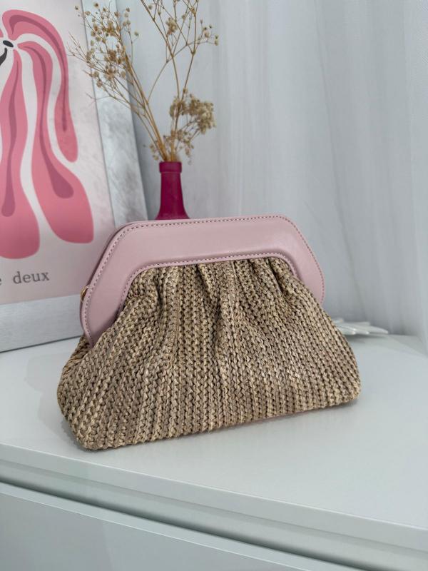 Bolso de arfia con detalle de polipel en color rosita, con un tamaño perfecto para meter lo imprescindible, lleva cadena dorada para colgar.