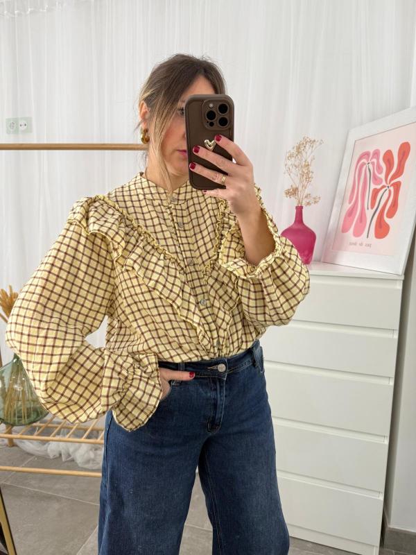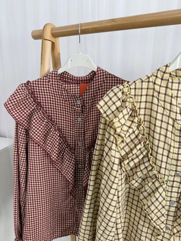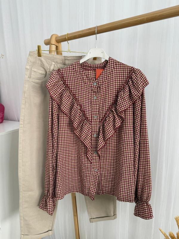 Camisa de tejido muy suave de estampado de cuadros y volante desde delante hacia atrás.