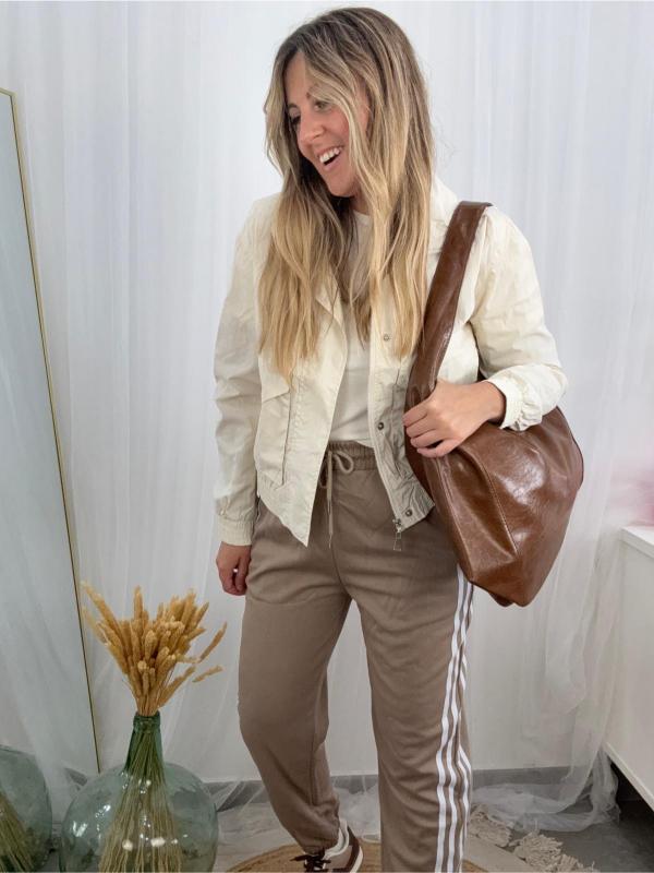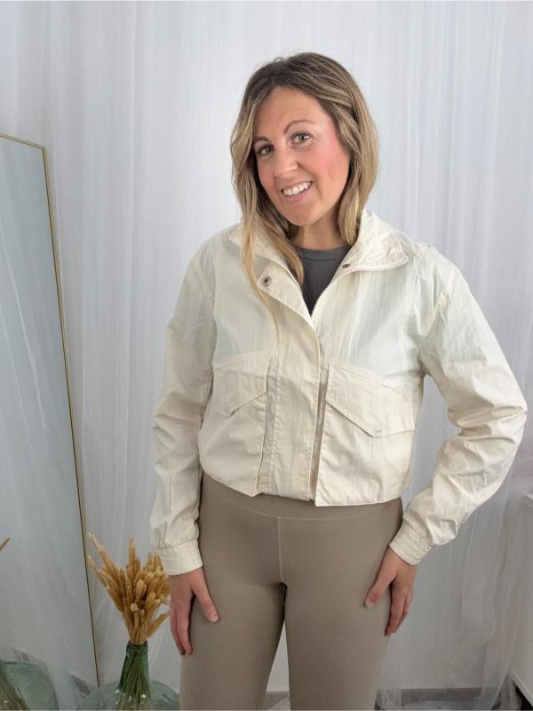 Chaqueta estilo cortavientos con forro en color crema , lleva bolsillos, botones y cremallera, con engomado en la parte de abajo. Ideal para tus looks deportivos o más casual.
