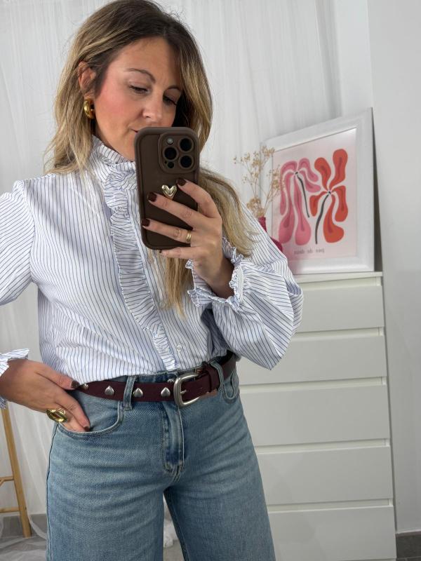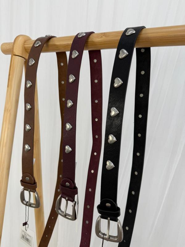 Cinturón de polipiel con detalle de hebilla y corazones plateados.