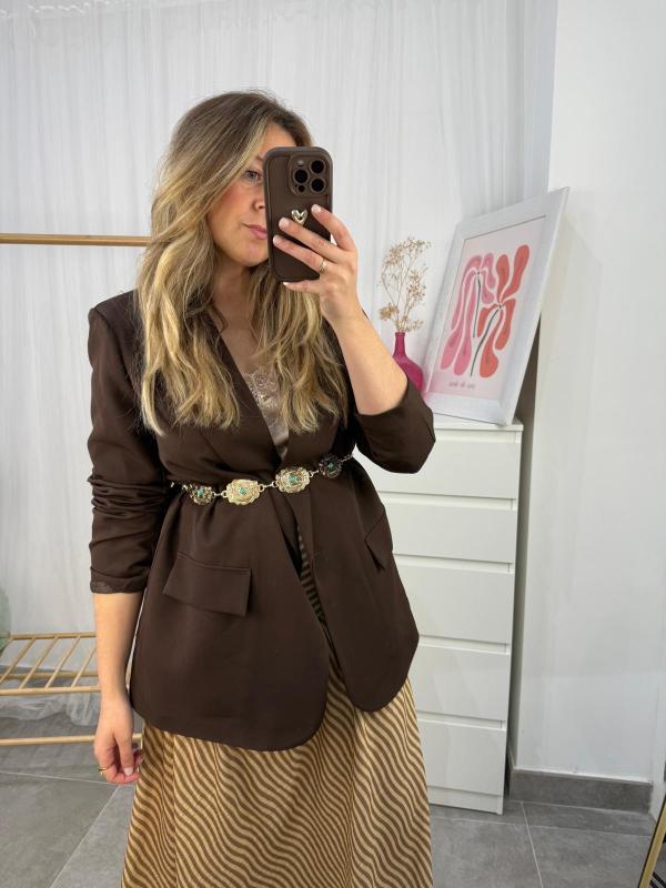 Cinturón metálico dorado ajustable con detalle de piedra turquesa, ideal para todos tus looks.
