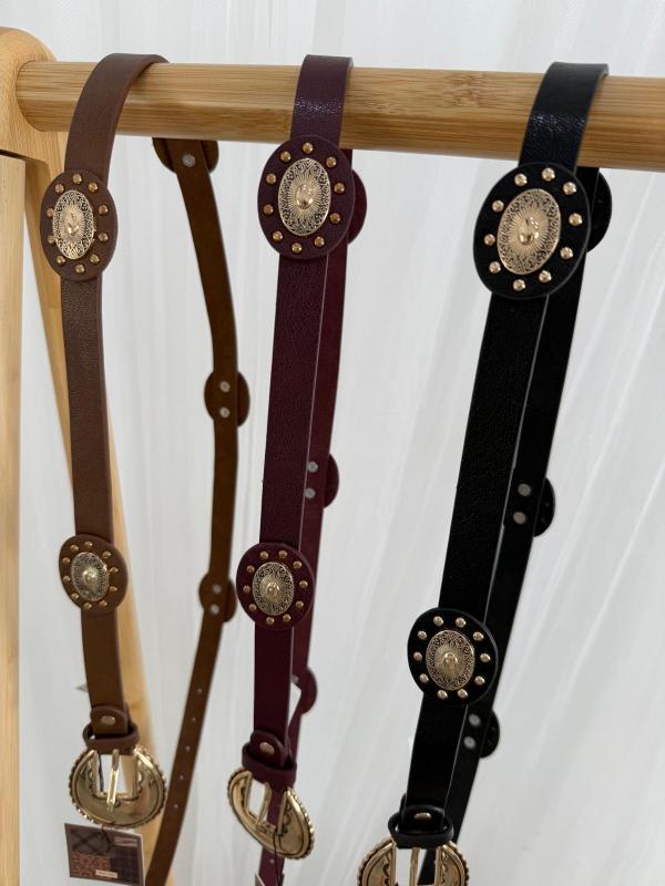 Cinturón de polipiel fino con detalles ovalados y hebilla dorada.