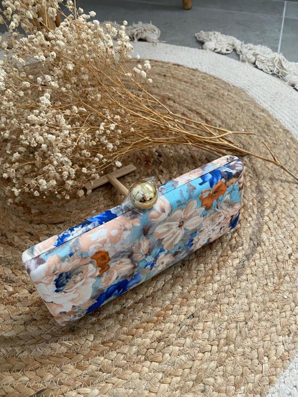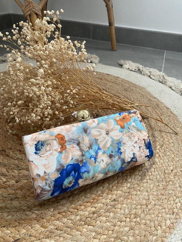 Bolso fiesta rígido con estampado floral en tonos azul. Lo puedes llevar de mano o colgado lleva cadena larga.