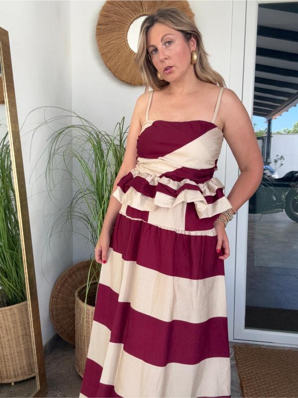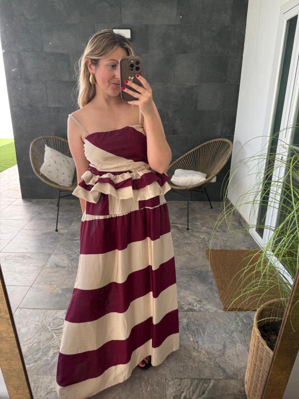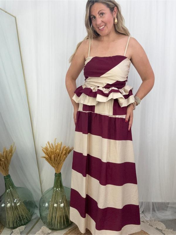 Conjunto de top estilo globo con falda larga en tono beige y burdeos, ideal tanto junto para todo como por separado.