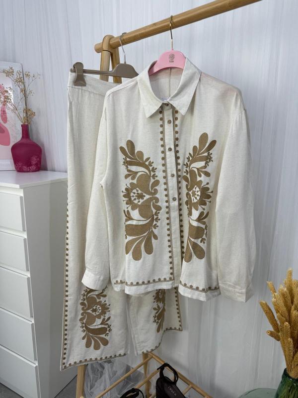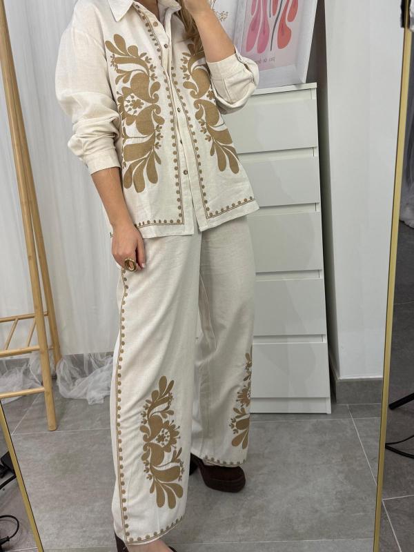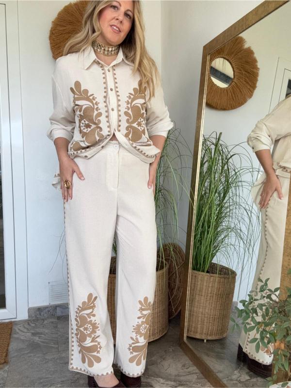 Conjunto de camisa y pantalón en tono tostado con dibujo bordado en hilo color camel. Ideal para tus looks casual o más arreglado tanto combinado junto o por separado. 80% algodón 20% lino.