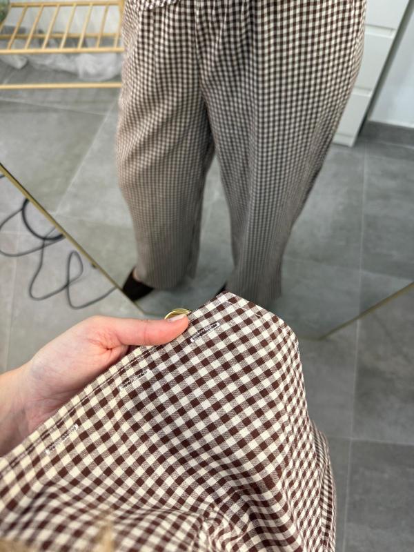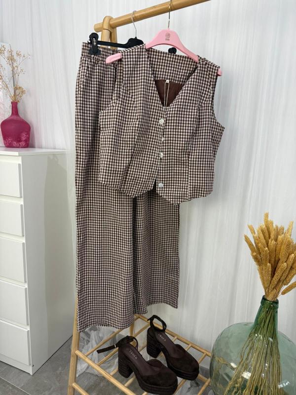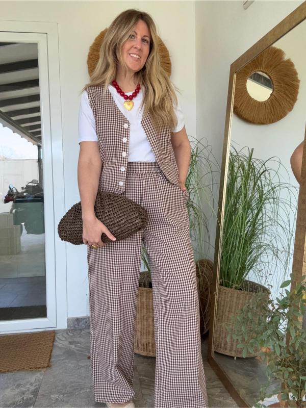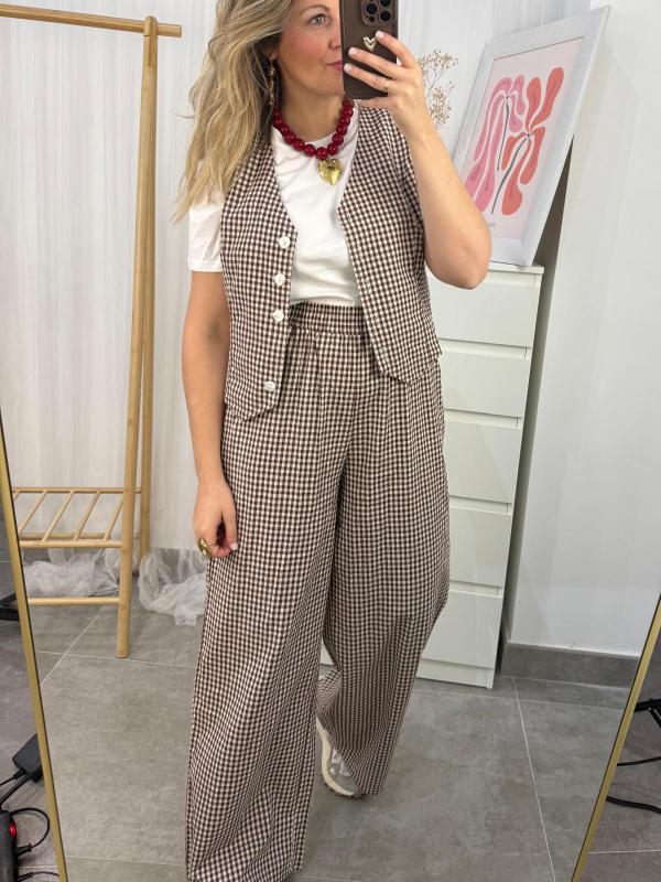 Conjunto de chaleco y pantalón de corte recto suelto con estampado de vichy en color marrón, un conjunto 100% algodón ideal para combinarlo junto o por serparado.