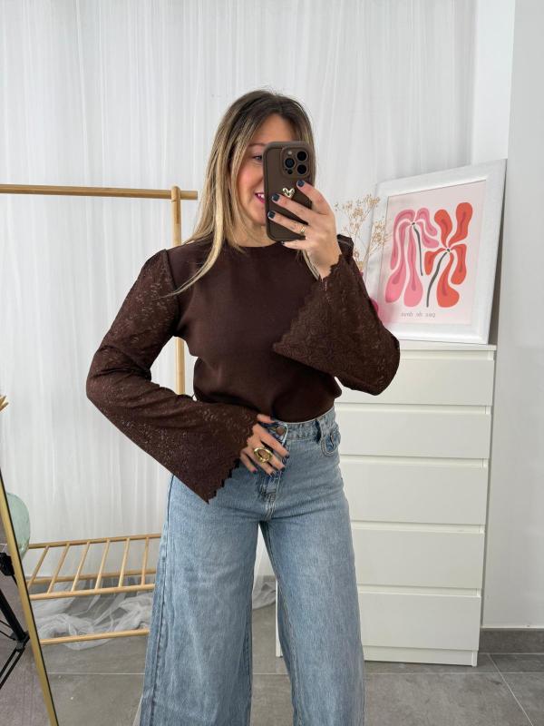 Jersey de punto canale en color marrón con mangas de encaje acampanadas.