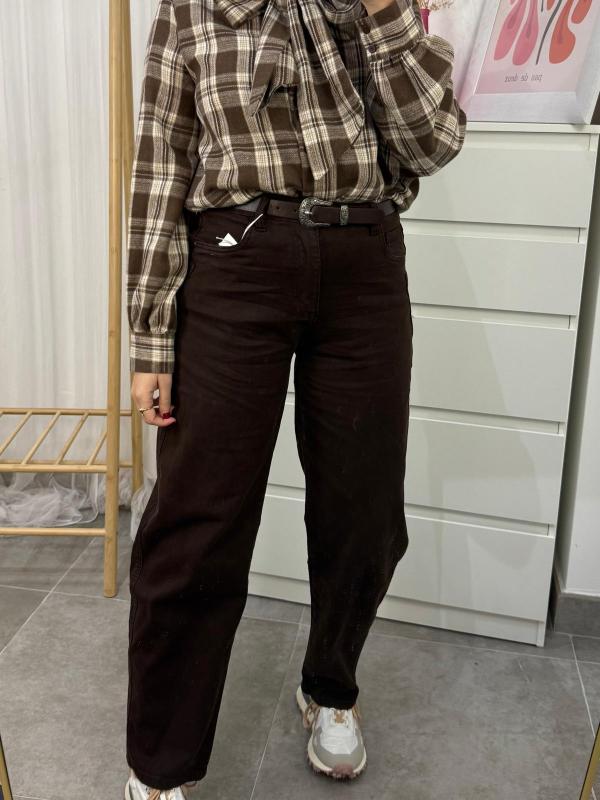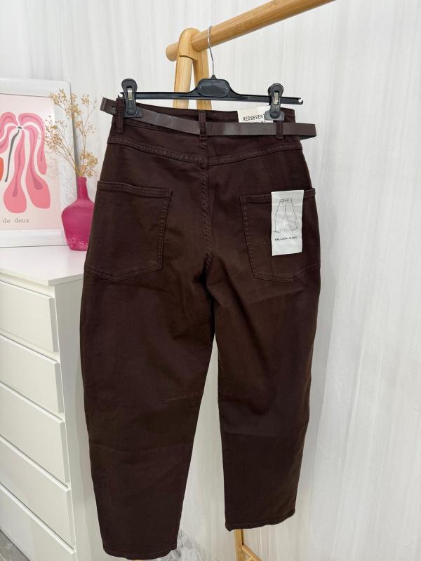 Pantalón vaquero de algodón muy suave con un 2% de elástico en color marrón choco estilo balloon, con detalle de bolsillos desde la cadera atrás también incluye cinturón.