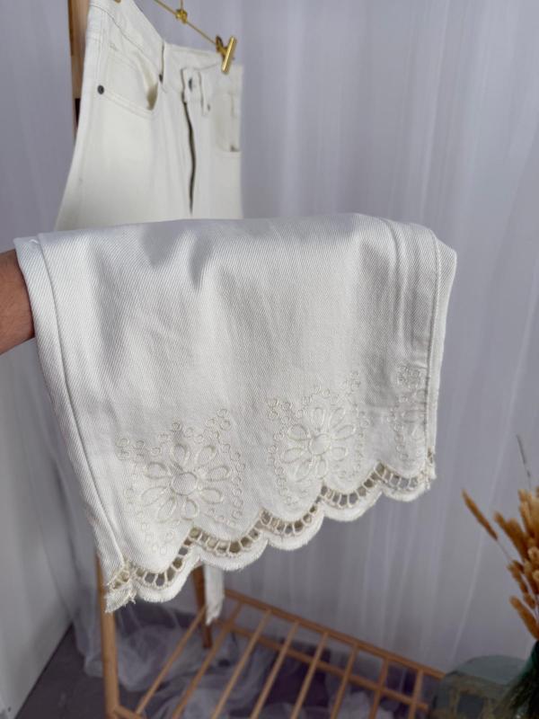 Pantalón vaquero muy suave en color crema (no transparenta) estilo culott con detalle en el bajo bordado y troquelado.
