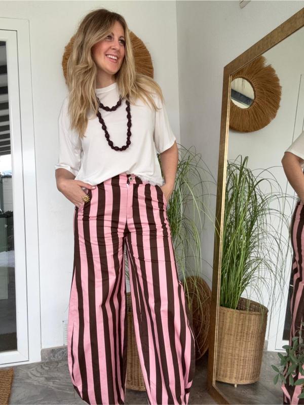 Pantalón estilo globo de algodón con un 2% elástico de rayas combinadas en rosa y marrón.