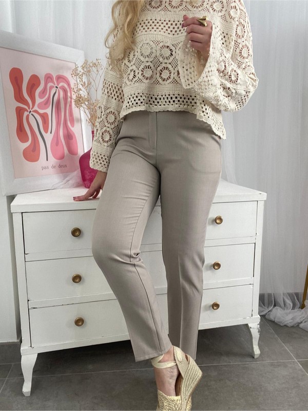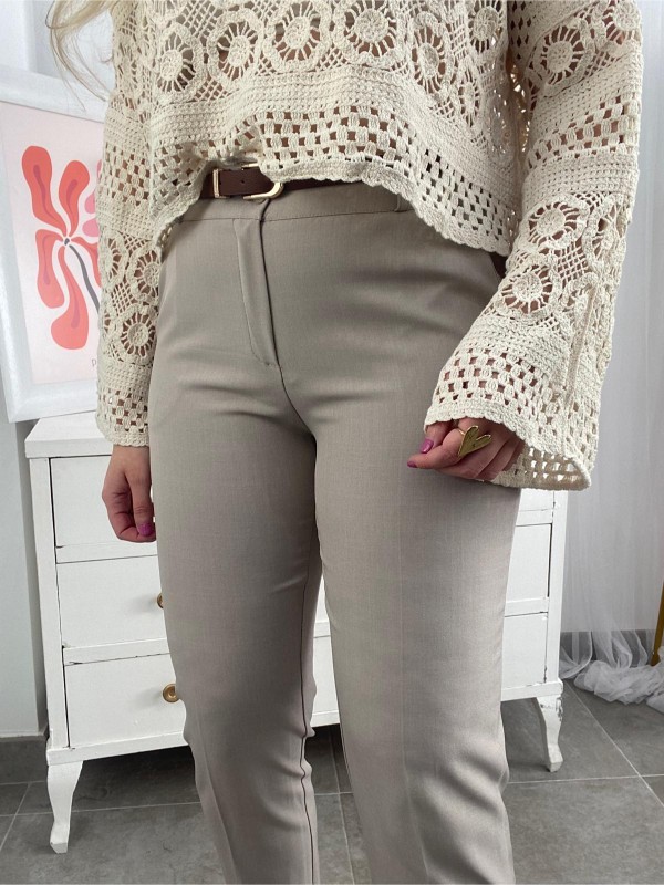 Pantalón de tejido fino, talla medio en color taupe ( entre gris y beige) con cinturón incluido.