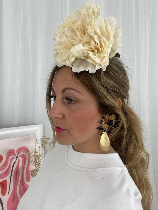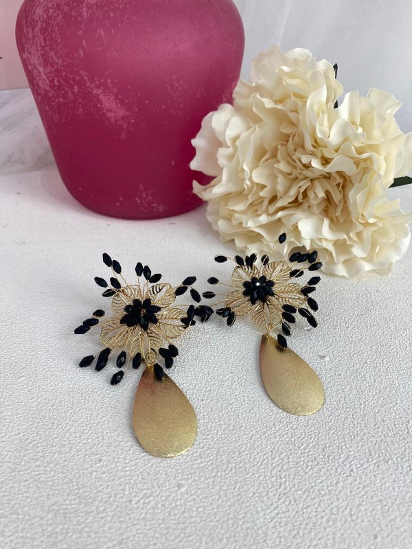 Maxi pendiente dorado con detalles negros ideal para tus looks de fiesta o ferias.