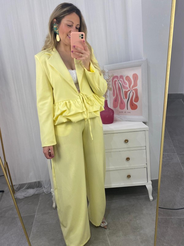 Traje compuesto de chaqueta con forro, hombreras y detalle de volantes y pantalón de tejido suelto y fluido en color amarillo. Luce perfecta en tus eventos, ferias o conjuntado por separado.