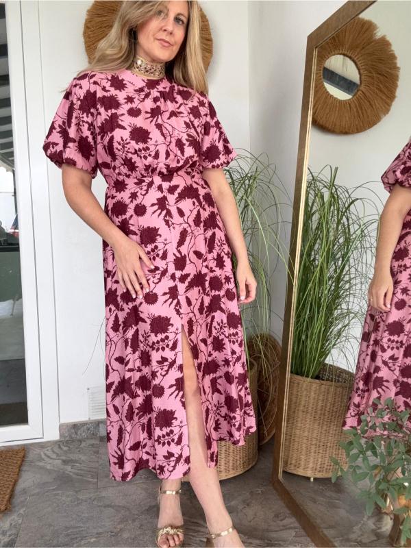 Vestido corte midi de un tejido fino y fluido en color rosa con la combinación de estampado burdeos y detalle de manga abullonada. Ideal para ir monísima y cómoda a tus eventos a para tus looks más casual.
